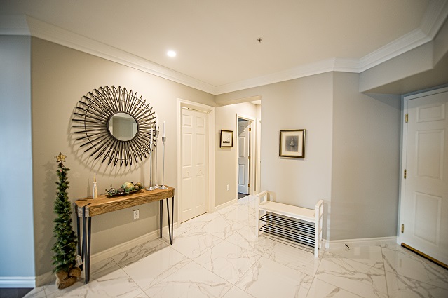 The condo remodel continued into the laundry room and storage area that was updated into a modern butler’s pantry! This pantry includes open and built-in shelving, hidden storage with cabinets and countertops, laundry machines, and a small refrigerator. The porcelain tile floor gives this spaces a luxurious look and feel! Upgrading the existing condominium unit included new tile flooring throughout the foyer and bathroom as well as new hardwood flooring throughout the living space and kitchen.