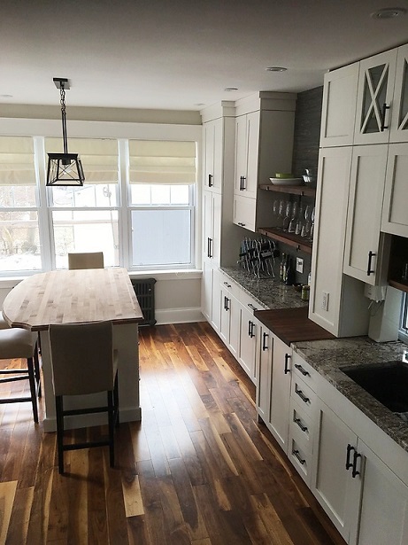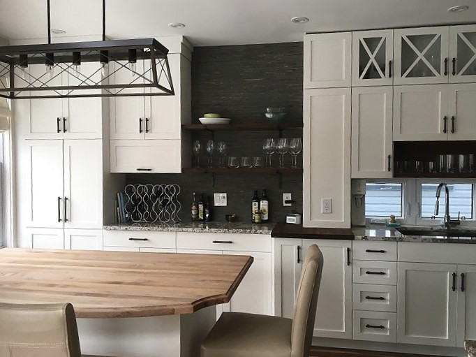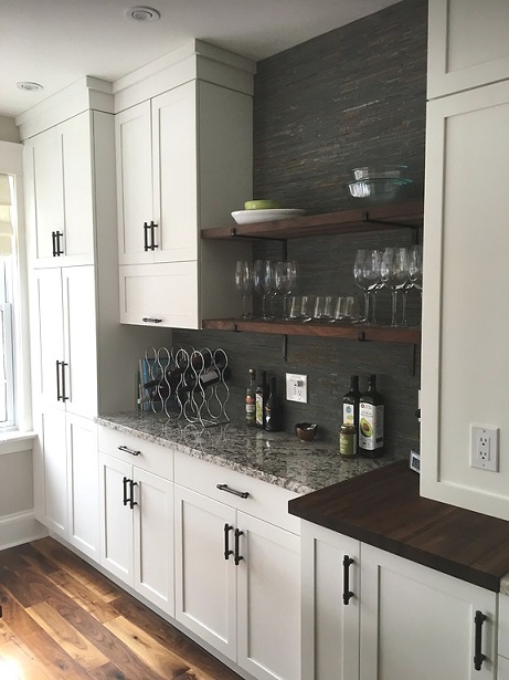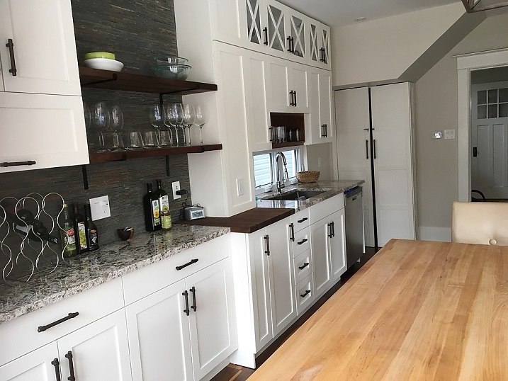 We enhanced the space and function in this Halifax kitchen by expanding the existing space adding pantry storage, island with storage, wine storage and open shelving. Seamlessly matching the existing finishes including cabinetry, hardware, granite counter tops, butcher block island top and a stone backslash.
