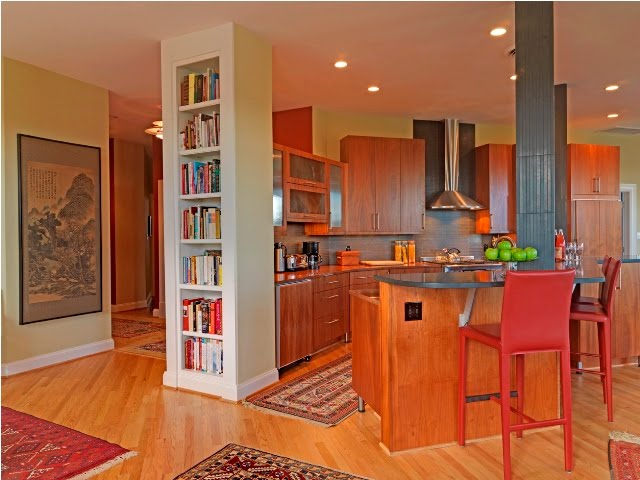 Remove walls – Opening up the space shared with a dining room or living room will make the kitchen feel larger . You can separate the spaces by installing a breakfast bar with stools. If you can’t remove the wall altogether, you can create a pass-through window between the rooms.