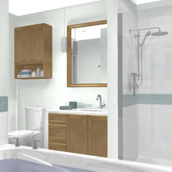 We started with re-tiling the space in simple, white subway-tiles. We added a pop of soft blue glass tiles as an accent. Adding a tiled nook to the shower allowed them to tuck their toiletries out-of-sight. The dated laminate counter and worn beige sink were replaced with a beautiful new marble top and under-mount basin. We hung pendant lighting on either side of the beveled mirror to add sparkle and reflect light. Storage was key, so the wall mounted cabinet allowed for plenty of extra towel space. To finish things off, we added some accent shelves for display art.