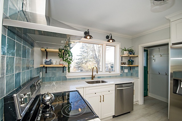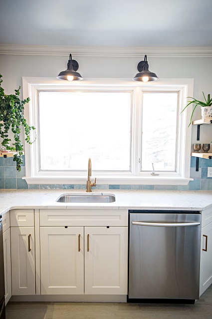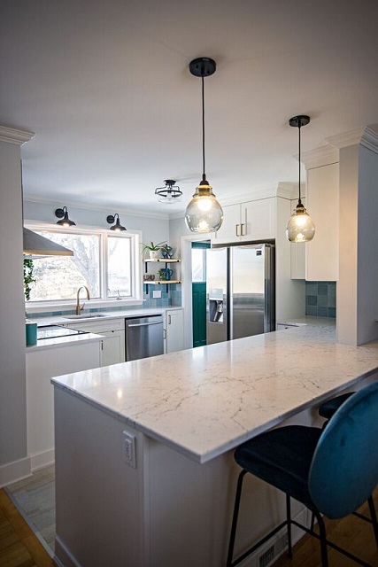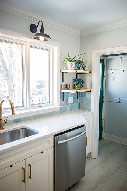 Opening up this floor plan with engineered beams allowed us to expand this closed in kitchen letting light into the open floor plan. Our team was able to include additional storage, counter space, and a peninsula to this Dartmouth kitchen design! This kitchen project included the installation of appliances, floating wood shelves, and cabinet hardware.