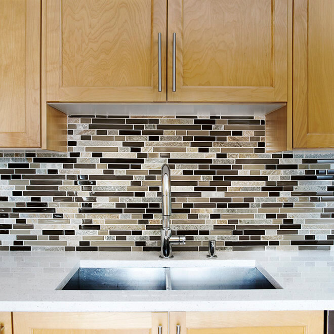 Adding a new backsplash brought plenty of character and visual interest to the space. The mosaic of earth-toned glass tiles mixed with natural stone adds texture, depth and sparkle. Combined with the shiny new quartz counter, much more natural light is reflected into the space.