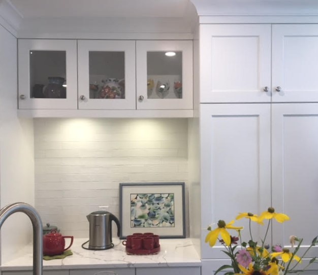 Our design team created a custom kitchen design for custom built in appliances and worked to integrate the existing lighting and exotic walnut flooring into the new design scheme. This all white kitchen features white shaker cabinets paired with white subway tiled back splash, a white quartz countertop, and clear glass inserts for three upper cabinets. As well as, two additional pantry pull outs, a pull out spice rack, deep pot drawers, and pot lights for additional lighting. Our construction team built custom pantry cabinet with bi fold door that recessed back into the cabinet for optional display of microwave or coffee bar. The detailed panels and moldings at the new island ties the kitchen together and increased the area from the dining room through to the kitchen to improve traffic flow and open up the space.