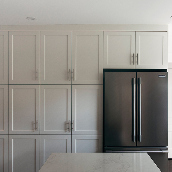 On the main floor, walls were reconfigured to let natural light shine throughout. The kitchen was completely remodeled and designed to be streamlined, open and accessible for the young family. The space includes a full pantry wall with roll-out shelves and tray dividers. Floating, open upper shelves let them display their beautiful dishware and keep the space open and airy.