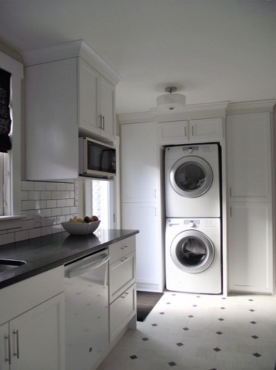 The cabinets are a combination of slab and 5 piece drawer front with crown moulding. The moulding matches the built-in laundry section in the kitchen to allow this renovation to flow seamlessly. We used shakers doors and slab drawer fronts finished with transitional metal brushed nickel drawer and door pulls.